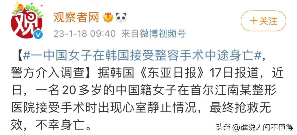 想写这一话题,是因为今天在热搜上看到了一则令人痛心的新闻:一名中国女子,在韩国接受整容手术中途身亡。
