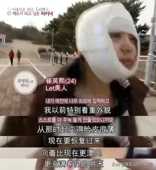 整容后,崔英熙的脑袋上缠着厚厚的纱布。她走在大街上接受采访时,信心满满地表示“向着比现在更漂亮,更充满希望的明天(努力)。”