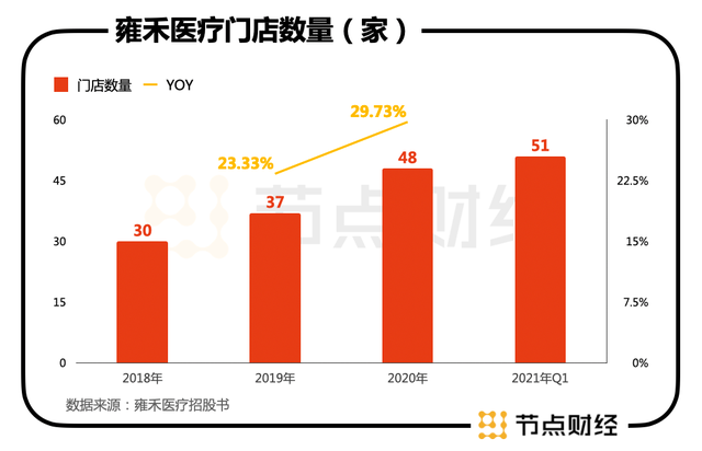 FUE技术取得了不错的回报,雍禾医疗自此开始扩张,先后进入上海、成都、武汉等城市,并于2011年正式获批了第一家门诊部。如今,雍禾医疗共拥有51家医疗机构,遍布中国50个城市。