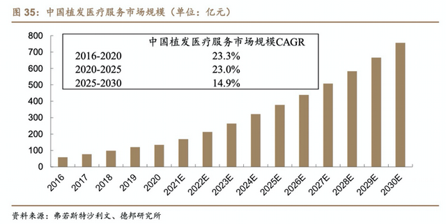 据其预测,随着植发可负担性越来越高、毛发问题越来越普及。2025年,中国植发服务市场规模将达到378亿元,复合年增长率23%;2030年,市场规模将进一步增长至756亿元,自2025年起的复合年增长率为14.9%。