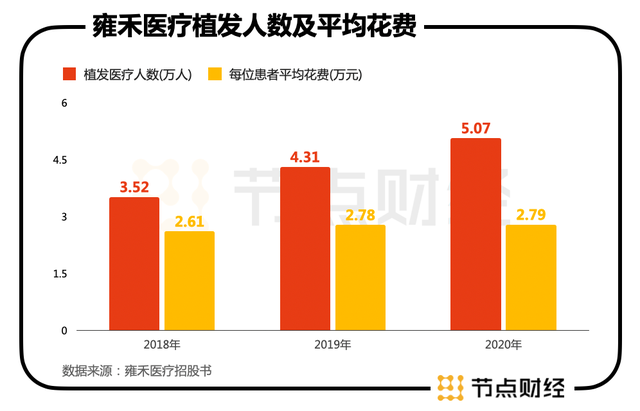 招股说明书显示,2018-2020年,分别有3.52万、4.31万、5.07万患者在雍禾医疗接受了植发手术,每名患者平均花费分别为2.61万元、2.78万元以及2.79万元。在2020年,95%以上的患者选择了普通级服务,3.6%的患者选择优质级服务,0.5%的患者选择贵宾级服务。