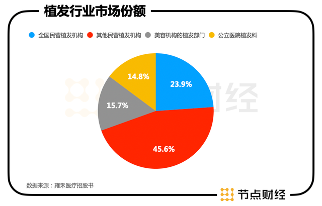 不过,在这块市场中,雍禾医疗也并非的玩家。实际上,国内提供植发服务的医疗机构广泛,包括雍禾医疗在内的民营连锁植发机构仅占据23.9%的市场份额,其余被公立医院植发科(14.8%)、医美机构植发科(15.7%)、民营非连锁植发机构(45.6%)瓜分,由于技术大同小异,行业内存在一定的同质化竞争。