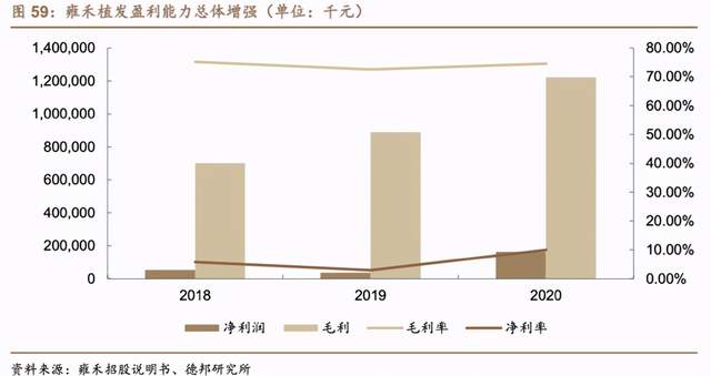 而从招股说明书来看,对于雍禾医疗来说,植发的利润相当可观。2018-2020年,雍禾医疗毛利率分别高达75.1%、72.6%、74.6%。这远远超过当前资本市场炙手可热的医疗服务白马股,比如爱尔眼科(46%-51%)、通策医疗(41%-46%)的毛利率。