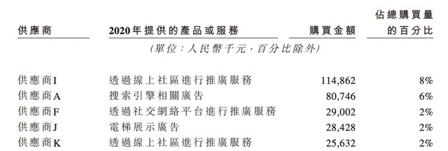 高企的销售费用几乎都砸在了广告上。2020年,其前五大供应商都是广告服务提供商,投的广告一方面包括地铁站、写字楼、商场的线下展示广告,与腾讯、今日合作的线上展示广告。另一方面,也包括与百度、微博、B站等平台合作的个性化广告,按照用户的点击量支付费用。销售人员还会走进大型企业举办活动,分享毛发养护的知识来获客。