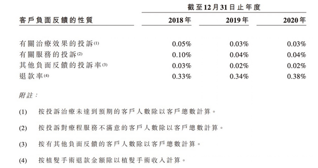 招股说明书显示,雍禾医疗在2018-2020年间,收到的客户负面反馈集中在调节效果及服务方面,近三年退款率分别为0.33%、0.34%、0.38%。