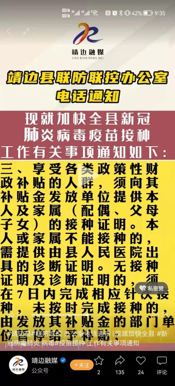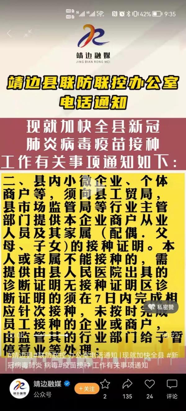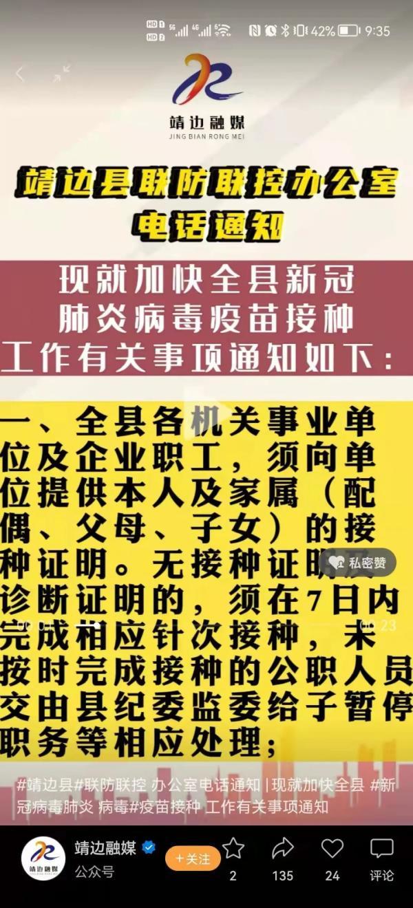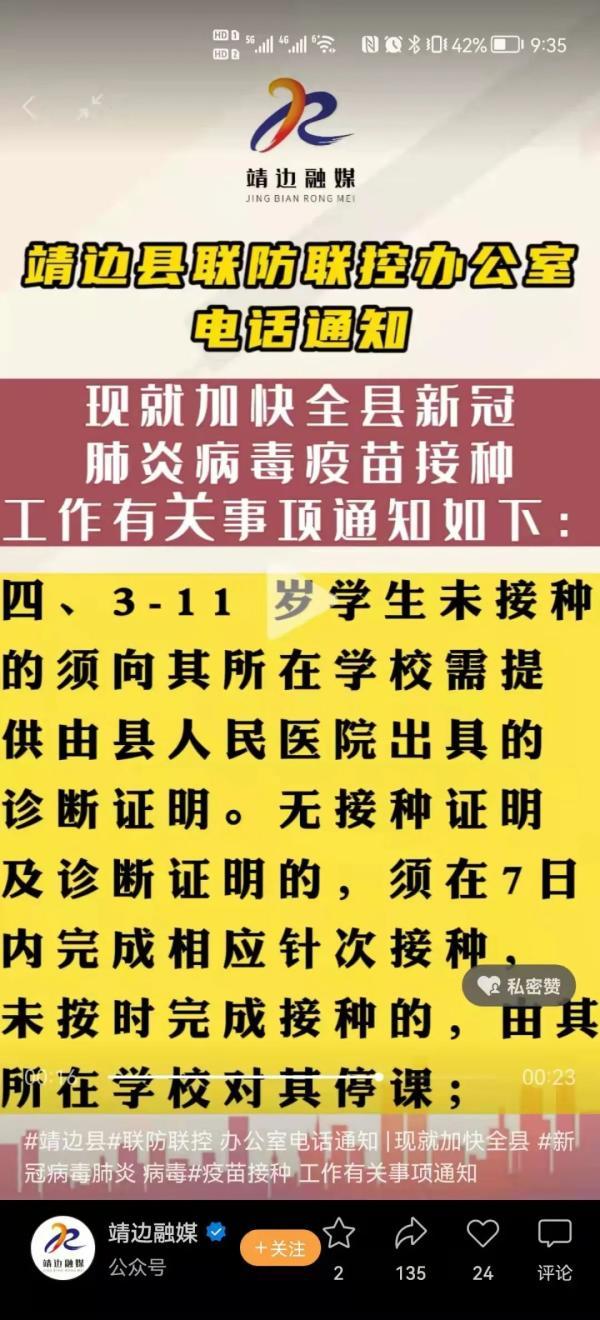 近日,靖边县这条“雷厉风行”的新冠疫苗接种令,可急坏了当地群众,“要求还要提供诊断证明,不然娃不能上学,这会儿要去哪里开?”“要停补贴!有点想不通”。