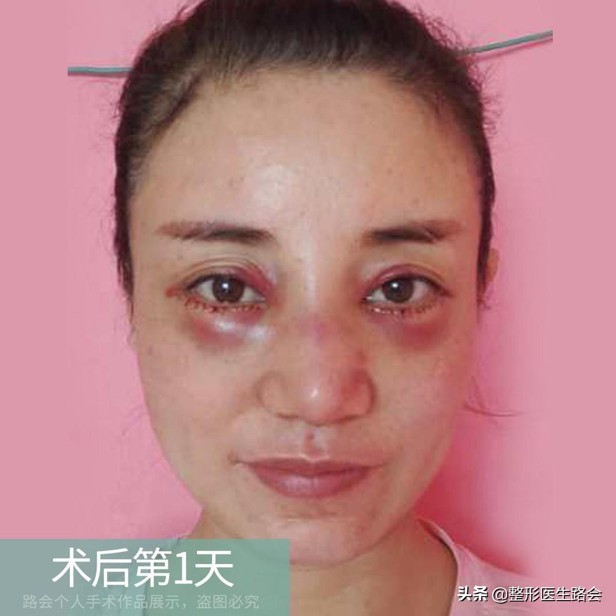 她在手术后半小时,就出现肿胀。术后第1天,她的肿胀情况较他人更是要严重一些,眼睛、包括上眼皮,肿胀十分,泛着红色;鼻子肿胀得厉害,甚至比手术前还要大,看着还有些歪斜(这是正常的,需要一个恢复的过程)。