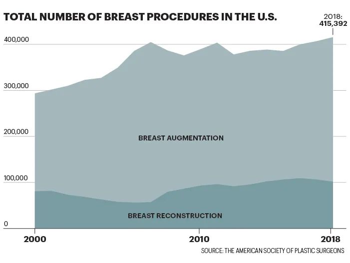 长期以来乳房假体都被视为身材的点睛之笔,人们将它嘲讽为女性的虚荣。而在嘲讽之余,大家却忽视了胸部整形为大量女性顾客带来的严重甚至是致命的健康问题。自2000年,已有超过800万名美国女性曾接受过胸部整形手术;仅在2018年,或为了变美或为了乳房重建,超过40万名女性接受过胸部整形手术。据美国整形外科医生学会统计,隆胸手术是受欢迎的医美手术。