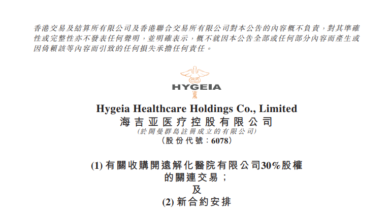 公告内容显示:公司拟以1530万元收购开远解化医院30%股份。据悉,此前海吉亚医疗已拥有开远解化医院约40%的的股份,此次交易完成后,将通过伽玛星科技间接持有开远解化医院70%的股份,并根据新合约安排控制将由买方所持有的开远解化医院余下30%股权。
