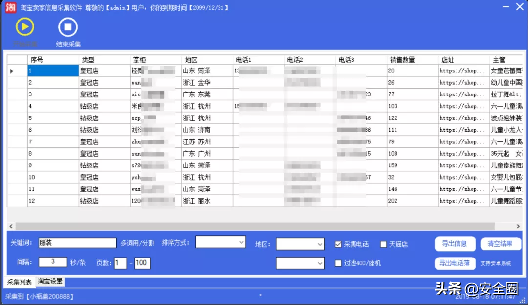 以淘宝商家信息采集为例,记者在该系统中的淘宝商家采集功能中输入关键词“服装”后,成功采集到北京地区淘宝卖家的82条信息,共耗时10分钟。在软件弹出框右下角还附有“导出电话铺”的按钮,采集得到的信息包括类型(店铺等级)、掌柜名称、地区、电话、店址等多个维度。