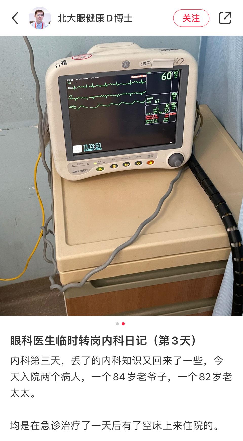 “全院一张床”更多的医生被调到病房。小红书博主“北大眼健康D博士”(以下简称D博士)每天更新一篇《眼科医生临时转岗内科日记》,1月6日已经发到第12篇。目前,他所在医院内科病房里只有肺部感染和合并症的新冠患者,而医治他们的则是内分泌科、外科和眼科医生。