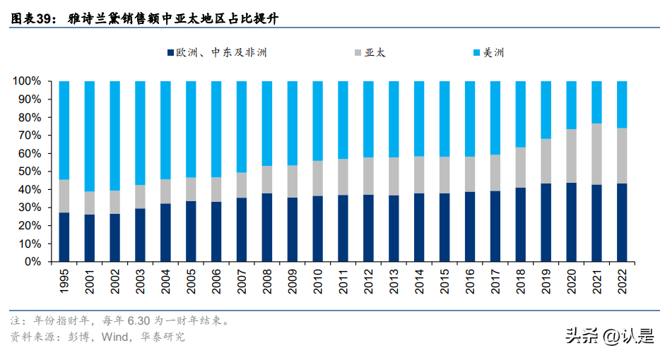 雅诗兰黛:从美国拓展至市场。雅诗兰黛集团于 1946 年在美国创立,1960 年在英国 伦敦亮相,此后十年陆续进军法国、德国、瑞典;1967 年公司进入亚洲市场日本,1993 年进军中国大陆市场;1974 年南非子公司成立,1996 年又进军中东。经过 30 年的扩张, 截至 1995 年,美洲地区收入贡献度降至 54%,亚洲地区提升至 18%,欧洲&中东&非洲 地区合计为 27%。此后,亚太及欧洲、中东、非洲的占比不断提升,2022 财年亚太/欧洲& 中东&非洲占比分别为 30.7%/26.1%。