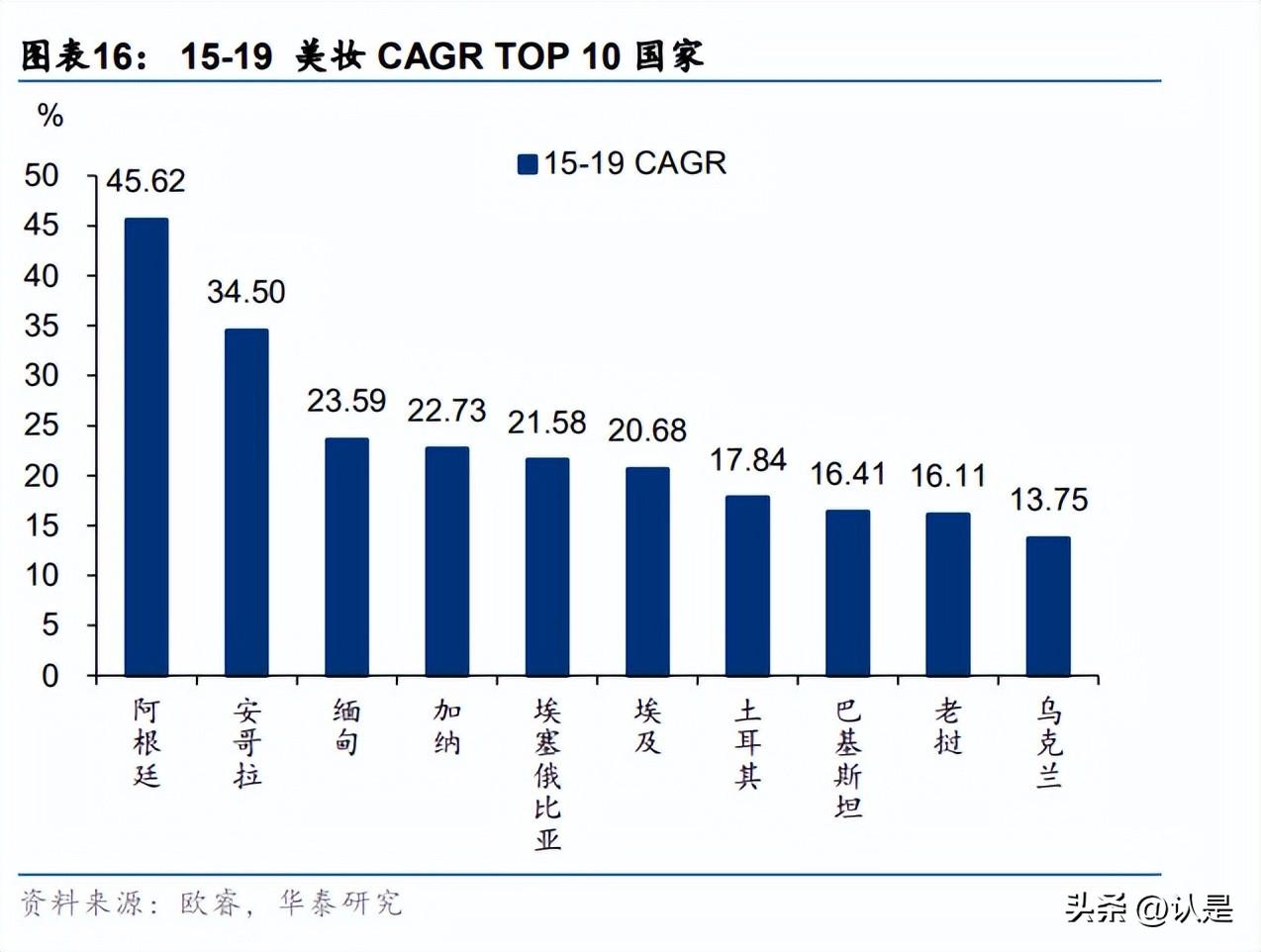 分,21 年美国、中国、日本占据美妆市场前三的市场份额。21 年美国/中国/日本 美妆市场规模分别为 1027.3/881.7/ 329.5 亿美元,美国和中国 21 年美妆市场同比增速超 过两位数,分别为 10.3%/16.7%。15-19 年美妆市场规模 CAGR 前 10 多分布在亚太、 拉丁美洲、中东及非洲地区,其中阿根廷增速高,15-19 年 CAGR 达 45.62%。