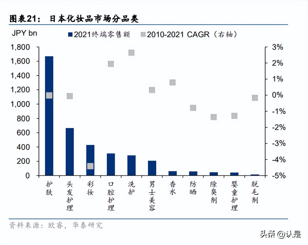 日本化妆品市场相对成熟。据欧睿,2021 年日本美妆市场规模 36168 亿日元/yoy-3%, 2010-2019 年 CAGR1%,增速趋缓。分品类,护肤为大细分领域(21 年规模 16696 亿 日元),其次为彩妆(21 年规模 6646 亿日元),洗护/口腔护理等市场增速相对略快。