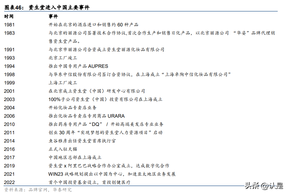 资生堂在中国:从大众市场到高端市场。1981 年资生堂进入中国,初在北京友谊商店、 北京饭店等九家大型商场,销售包括化妆品、香皂、牙刷用具等在内的 60 多个品种的产品。 1983 年,资生堂与北京的丽源公司签署技术合作协议,合作生产和销售日化产品,以 北京丽源公司“华姿”品牌代理销售资生堂产品。