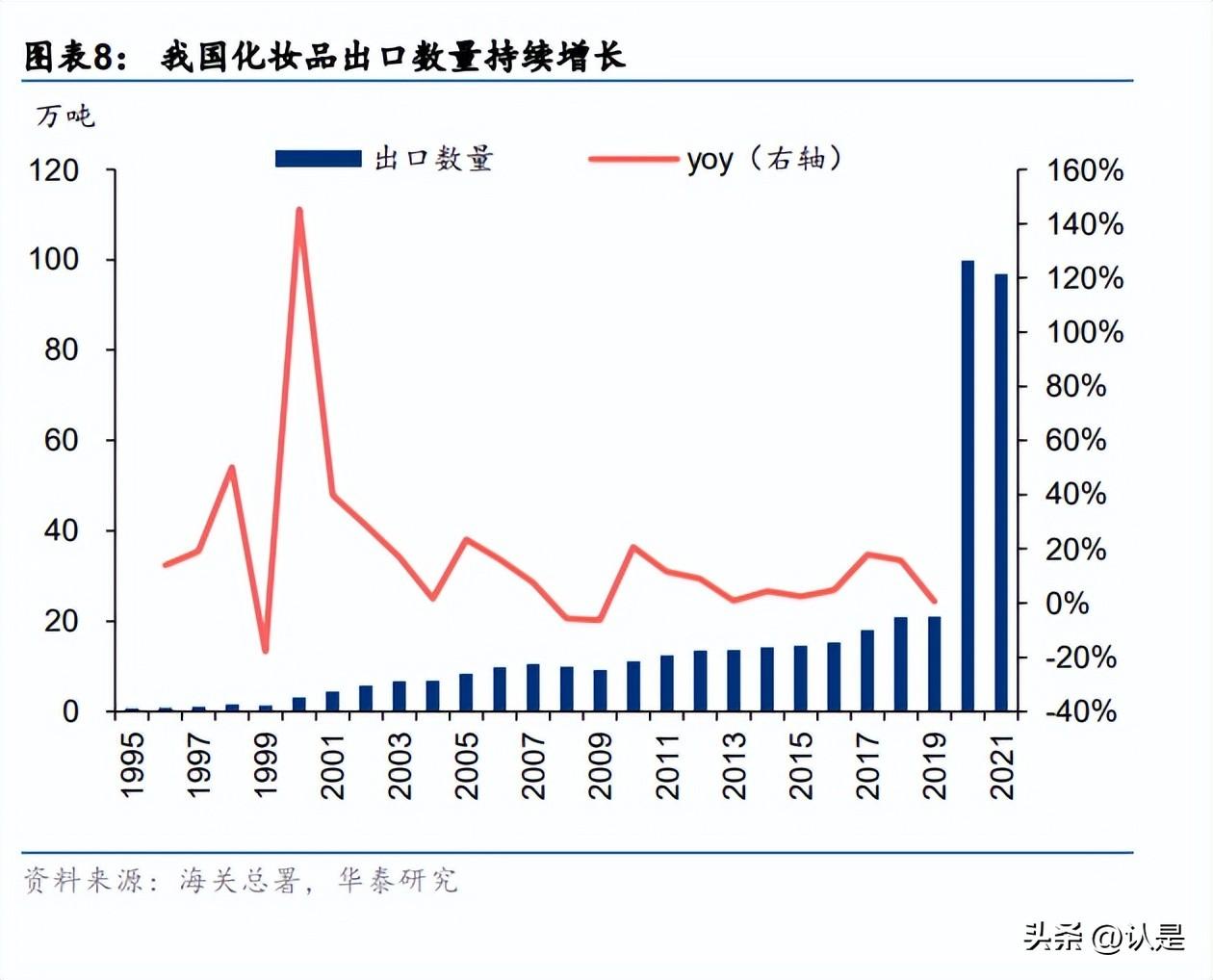 细长眉、眼下彩、点珠唇是具东方时尚感的中国妆容要素。据花西子,“细长眉”不同于欧 美式的挑眉,韩式平眉,中国妆的眉型是彰显温和而自信的细长眉;“眼下彩”指的是中国 古代的妆容重眉妆而不重眼妆,又因胭脂的广泛应用均在眼下颊上,故称眼下彩;“点珠唇” 则是因为大部分时期中国古代的唇妆都讲究盖住边缘往小画,打造樱桃小口,取其边去其 型,称点珠唇。海外 Instagram、Twitter、YouTube 等社交媒体上,中国妆正在日益风靡, 为本土品牌出海、走向世界提供契机,据海关总署,2021 年我国化妆品(美容化妆品及洗 护用品)出口金额 48.52 亿美元/yoy14.40%,而 10 年前仅为 12.23 亿美元。
