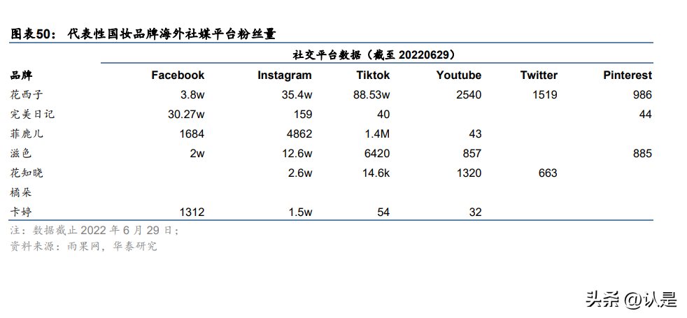 中国妆在日流行背后:天时地利人和皆有之。 1)天时:社媒平台兴起带来的流量红利; 2)地利:地缘优势决定中日两国消费者需求较为类似;欧美集团新品创新速度较慢,而此 前风靡的韩流彩妆没有较大变化。3)人和:据日经中文网特约撰稿人青树明子,日本女性拥有根深蒂固的“大和抚子”(指 代性格文静矜持、温柔体贴并且具有高尚美德气质的女性)传统思想,日本妆容更偏向温 柔甜美。而韩妆特点在于清透自然的底妆+气质温和的经典韩式平眉,整体以橙色、粉色为 主。对比之下,中国妆“Chiborg”通常以眼睛和嘴唇为重点,通常眉毛长而浓密、眉峰明 显,眼妆深邃、眼线稍稍上扬,轮廓分明,红色系且颜色饱和的唇色营造出锐利轮廓的外 观,彰显女性“独立不谄媚”、“自信”、“成熟美”等特色。