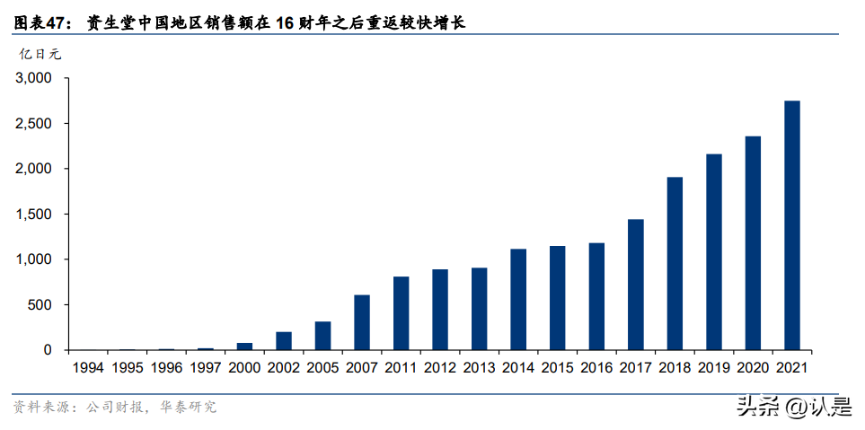 4)加注中国投资。为了更好地参与到中国本土的创新、投资,资生堂于 2019 年设立了中 国事业创新投资室;2021 年,在上海奉贤区“东方美谷”设立了其在中国的第三个研发中 心。资生堂将这里视作中国美容、美妆事业的硅谷,能通过联合上下游企业实现本土创新。 中国已经成为资生堂第一大市场,高端品牌领衔增长。2021 年,资生堂中国市场销售额 2747 亿日元/yoy16.5%,营收占比达到 26.6%,仅次于日本本土市场的 26.7%。2022H1,资生 堂中国地区销售额 1157 亿日元/yoy-19.7%,已经成为集团第一大市场。