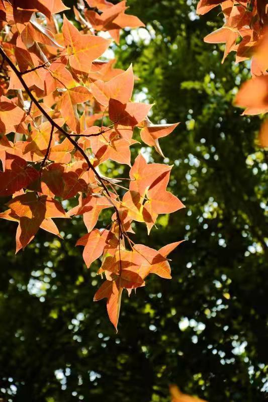 4.枫香推荐理由:枫香叶形独特,春夏绿意盎然,秋季逐渐变为橙色叶,浓淡相宜,常与常绿树种作块面色彩布置,是园林绿化中的重要树种。