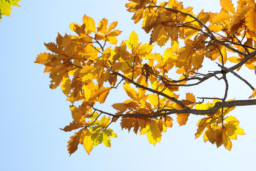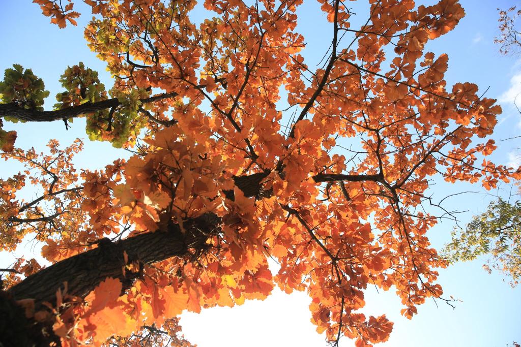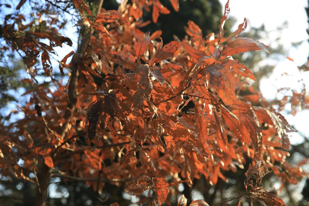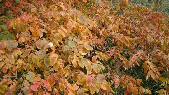 17.槲树推荐理由:树干挺直,叶片宽大,树冠广展,寿命较长,叶片入秋呈橙黄色且经久不落,可孤植、片植或与其他树种混植,季相色彩极其丰富。槲树是椭圆形的叶子,中间有一条叶脉,两边分出七、八条支脉,叶子的周围是锯齿状的花边。柞树结的果实,形似蚕茧,又称栗茧,橡子的外表硬壳呈棕红色,内仁似花生仁,含有丰富的淀粉。
