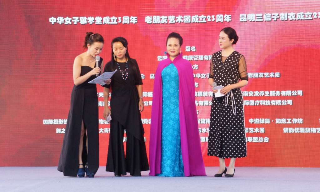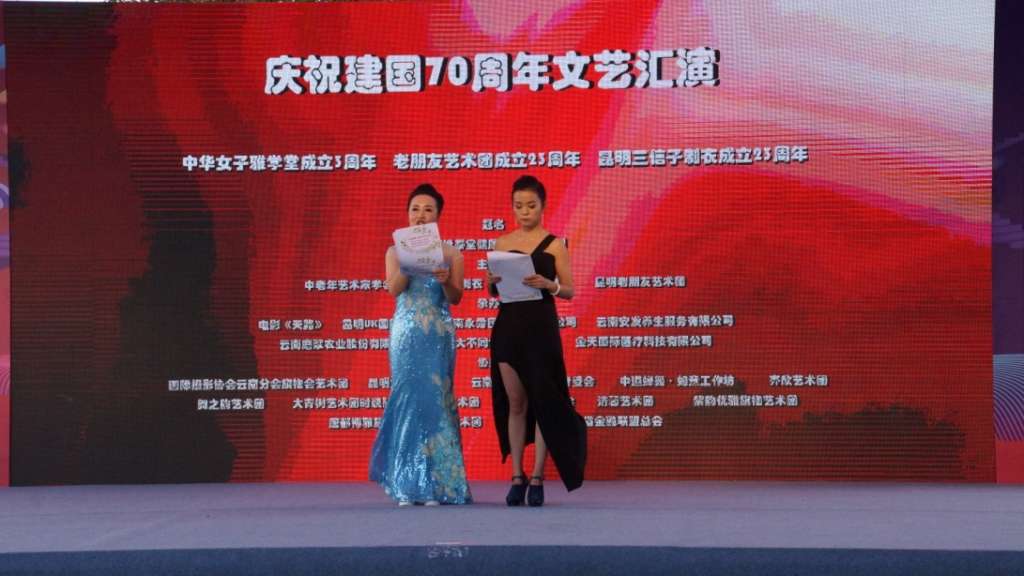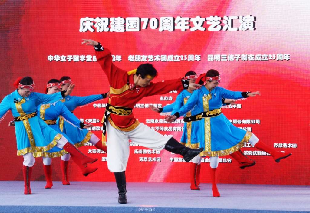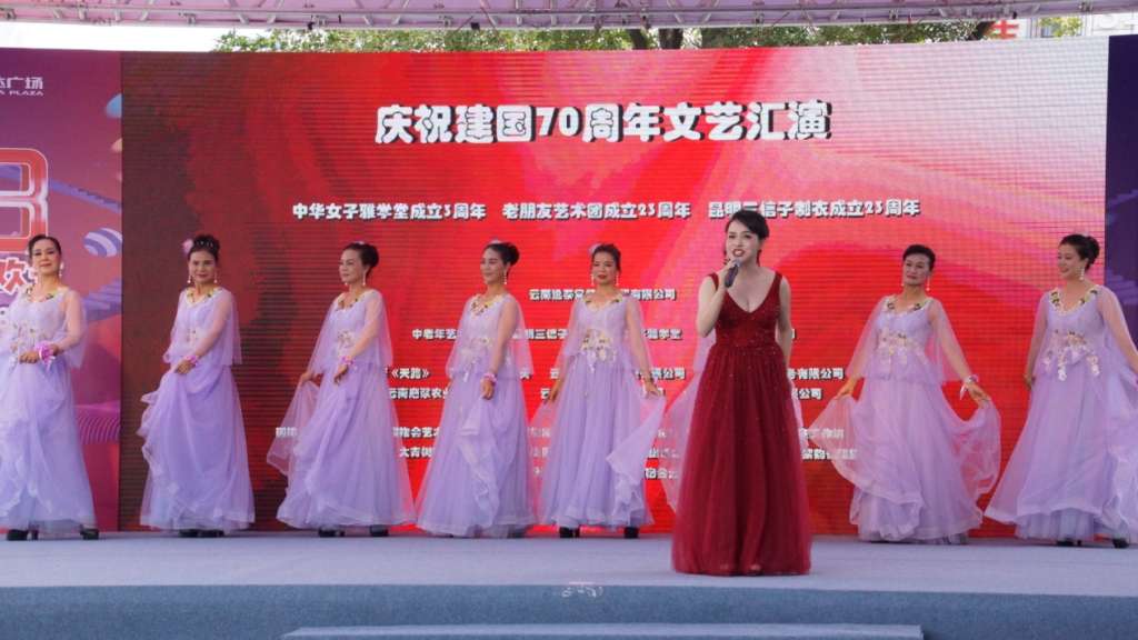 在举国上下隆重庆祝中华人民共和国成立70周年的日子里,8月18日上午,由云南逸泰堂健康管理有限公司冠名, 中老年艺术家学会、昆明三信子制衣、中华女子雅学堂、昆明老朋友艺术团主办, 电影《天路》、昆明UK国际医美、云南永秀民族服装有限公司、云南安发养生服务有限公司云南磨浆农业股份有限公司、云南大不同食品有限公司、金天国际医疗科技有限公司承办,国际摄影协会云南分会旗袍会艺术团、昆明霓裳旗袍团、云南时尚旗袍、文化专委会、中道蝉舞·如意工作坊、齐欣艺术团、舞之韵艺术团、大青树艺术团时装队、乐尚园艺术团、云水逸旗袍会、清馨艺术团、紫韵优雅旗袍艺术团、唐都博雅旗袍、芳草艺术团、中国旗袍会云南省金融联盟总会协办的“庆祝中华人民共和国成立七十周年大型文艺汇演”中老年文艺专场在昆明万达广场隆重举行,参加演出活动的演员达到了四百多人。