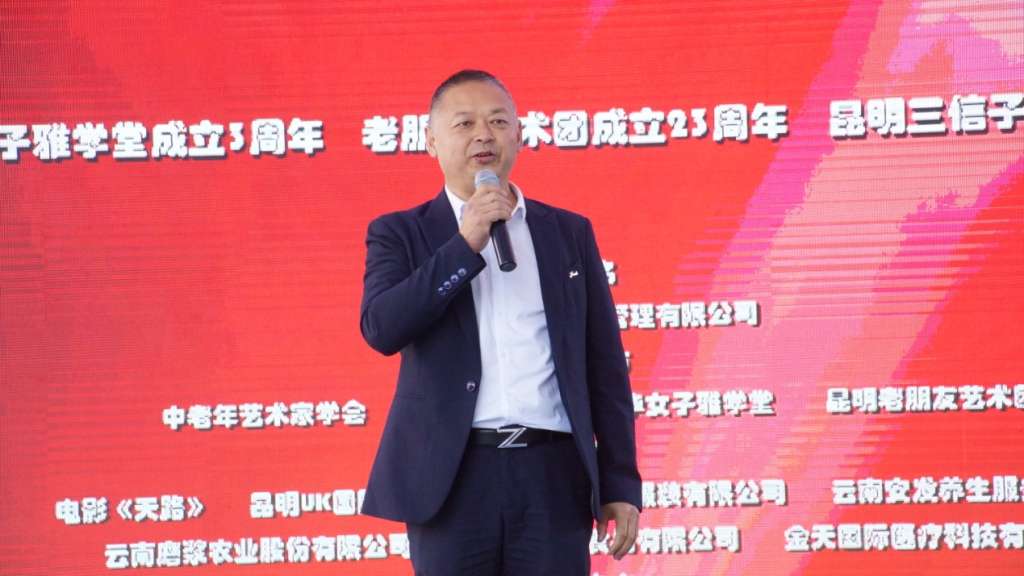 昆明中老年艺术家学会会长李超英致词,他说:在国庆七十周年华诞到来之时,我们今天举行的演出活动的目的就是要讴歌伟大祖国七十年来所取得的伟大成就,用歌声和舞蹈表达我们对祖国母亲的热爱!