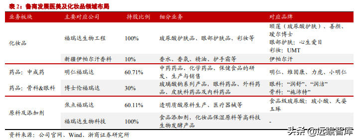 福瑞达成立于 1993 年,以医药和化妆品为核心业务,是透明质酸研发和应用技术的领跑者,旗下拥有“润舒”、“润洁”、“施沛特”、“颐莲”、 “善颜”、“瑷尔博士”等多个知名品牌。继福瑞达之后,公司于 2019 年收购山东焦点生物 60.11% 股权,完善透明质酸原料产业链,为其福瑞达医药旗下化妆品的原料采购提供新的通道。