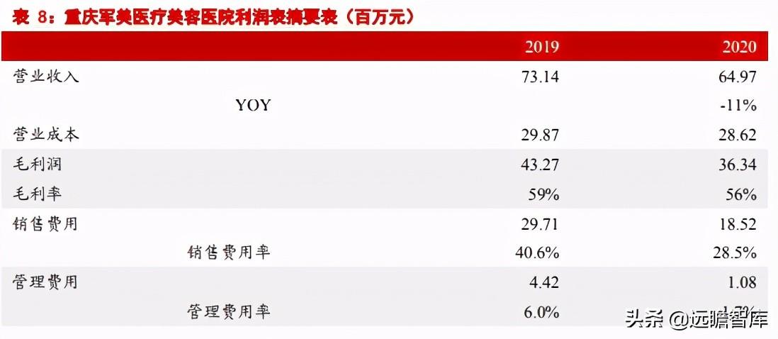 2020年军美医院(重庆军美医疗美容医院有限公司)营收/净利润6497/951万,同比下降11%/增长23%,毛利率/净利率为55.5%/14.6%。收入下滑主要原因为2019年8月公司剥离了背光业务的生产制造端,2020年背光业务营收和利润下滑。