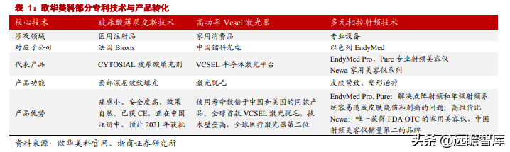 欧华美科专利壁垒深厚+销售实力领先,产品储备充足。研发专利来看,知识产权储备丰富,技术成果转换为多层次产品矩阵。公司拥有创新生物材料、高功率VCSEL激光器和多元相控射频技术等专业技术,并围绕专利技术打造多款重磅产品,包括法国 Bioxis 旗下 3 款玻尿酸产品、镭科光电的两款激光设备等,预计在未来 1-2 年内将陆续 获批上市。