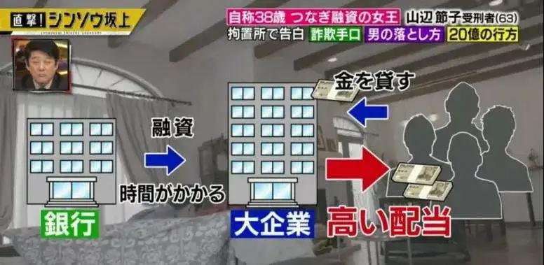 山边节子谎称自己是东芝、夏普这些大企业的代表来融资,向民众借钱,谎称不但保本,一年的收益还高达25%。