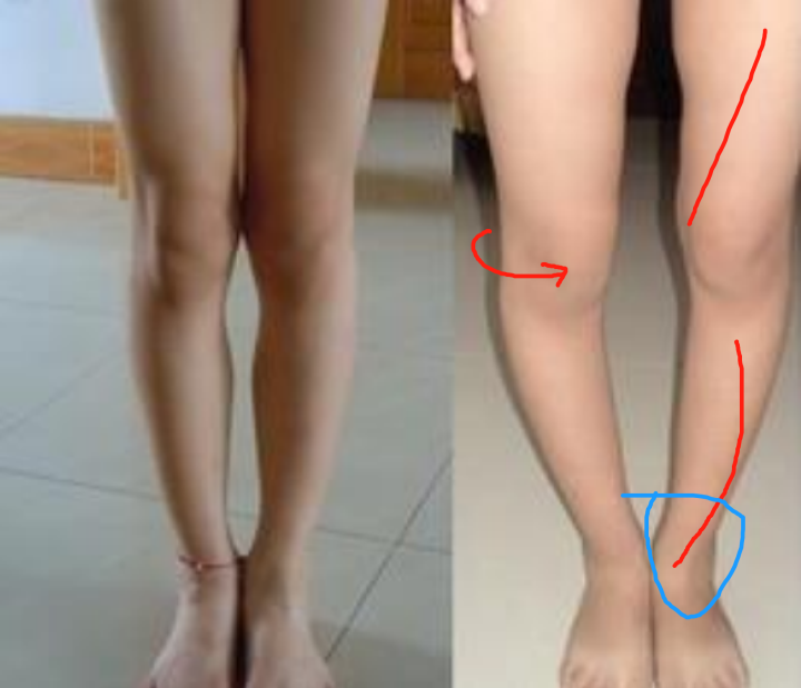 因为膝盖是内旋的,小腿因为脚踝无力,所以歪曲到了一边,看起来好像小腿弯了。