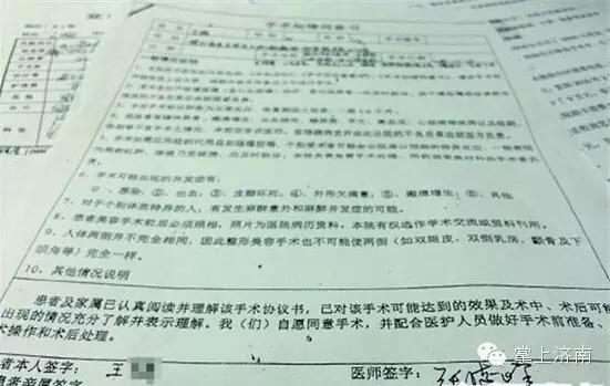王女士的爱人杨先生向记者出示了济南添美医院为王女士开具的手术交费单、手术前须知、面部手术术后注意事项、手术后注意事项、手术知情同意书、刷卡小票等材料。王女士称“手术当天根本没见过这些材料,更没在这些材料上签过字。”更重要的是,杨先生称,添美医院所提供的两份手术知情同意书内容不一致,存在伪造之嫌。而当时承诺的海外博士医生,也变成了一位名叫“张凌峰”的医生。