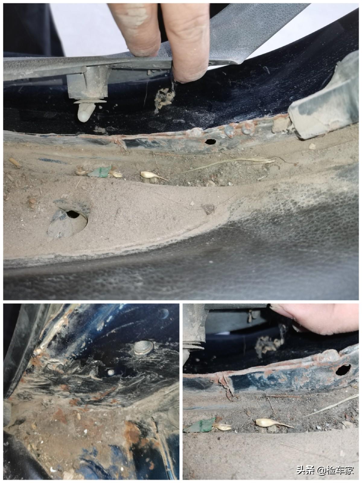 马上打脸就来了,刚看到右后叶子板就有了重大发现,漆膜仪数据从右尾灯处一直向前延伸加大,直至漆膜仪爆表。拉开右后车门,扒掉车门密封胶条,面前是锈迹斑斑的右C柱里口,切割焊接加钣金整形,事故车没跑了!这种程度的修复,可以想象到侧面的剧烈撞击的情景,对右侧的侵入量还是蛮大的,右后门显然不能幸免。没有波及到右前门和右前叶子板,前面一切正常。
