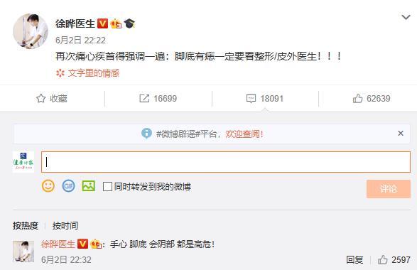 有网友在评论区晒出自己脚底的痣,徐晔医生直接建议:切除!