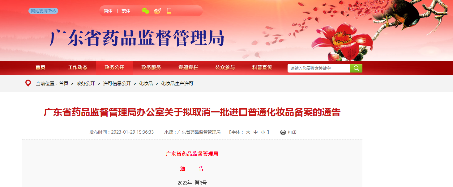 广东省药品监督管理局办公室关于拟取消一批进口普通化妆品备案的通告