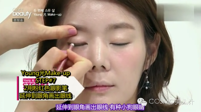 8.将打底眼影和妆前乳混合涂抹在眼皮上,用粉红色的眼影笔延伸到眼角画出眼线,尾部稍稍降低,下垂式眼线是减龄重点,再利用粉红色的眼影笔填充眼角的下眼线眼影。