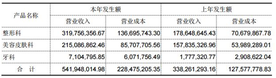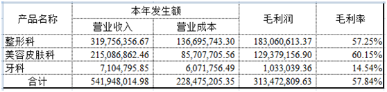2016年度H整形医院主营业务综合毛利率为57.84%,其中:整形毛利率为57.25%、美容皮肤毛利率为60.15%,而牙科毛利率仅有14.54%: