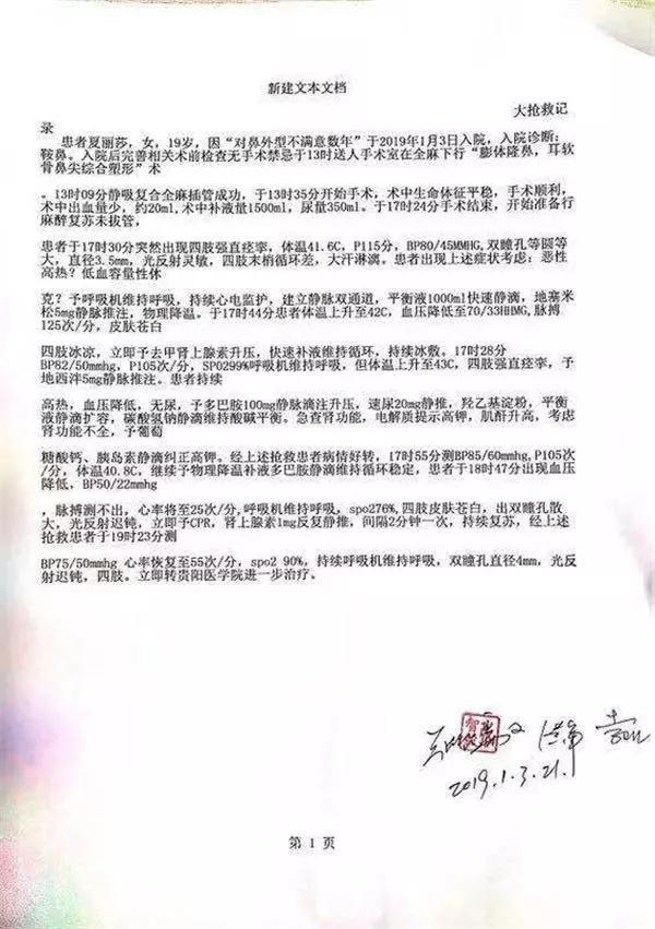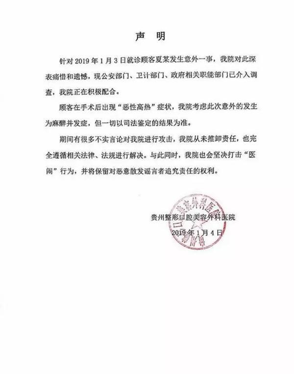 医院声明1月4日下午,利美康整形医院发布声明回应表示:夏丽莎手术后出现 "恶性高热" 症状,疑似麻醉并发症,目前相关部门己介入调查。(原标题:痛!隆鼻手术发生意外,19岁大二女生香消玉殒)
