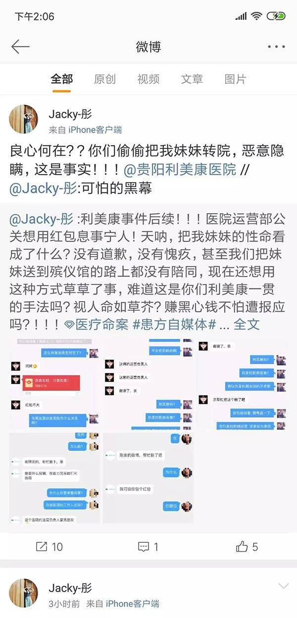 值得寻味的是,根据夏丽莎家属给贵州都市报冲锋鸡记者出示的资料显示,当夏丽莎的家属就此事求助于社交媒体时,有自称利美康运营负责人的网络公关人员,通过私信转发红包给夏丽莎家属,希望对方不要扩散此事。