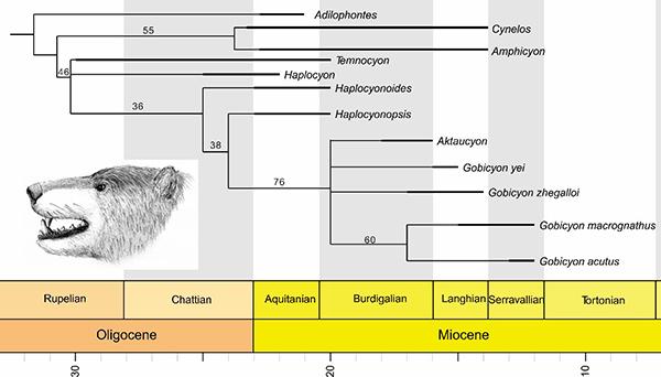 近,中国科学院古脊椎动物与古人类研究所博士研究生江左其杲等在Papers in Palaeontology 在线发表了关于中国北方宁夏同心和甘肃和政地区戈壁犬的新材料,包括数件上下颌材料。作者详细地对比了内蒙古通古尔地区的巨颌戈壁犬Gobicyon macrognathus(模式种),认为同心地区中中新世早期的戈壁犬形态更加原始,P4原尖较大,M2较大,存在M3,应该代表早期的戈壁犬,建立新种叶氏戈壁犬Gobicyon yei sp.nov.,种名献给为同心地层古生物做出巨大贡献的叶捷先生。同心可能年代稍晚的材料和通古尔的材料十分接近,归入巨颌戈壁犬。和政牙当的戈壁犬形态更加进步,前臼齿粗壮化,P4原尖退化,M2缩小,代表已知进步的戈壁犬,建立新种尖齿戈壁犬Gobicyon acutus sp.nov.。同时在同心地区发现了半颗下裂齿,但这颗下裂齿有的下后尖,符合哲氏戈壁犬Gobicyon zhegalloi的特征,增大了这个种已知的分布(之前只发现在蒙古西部和中国新疆北部)。