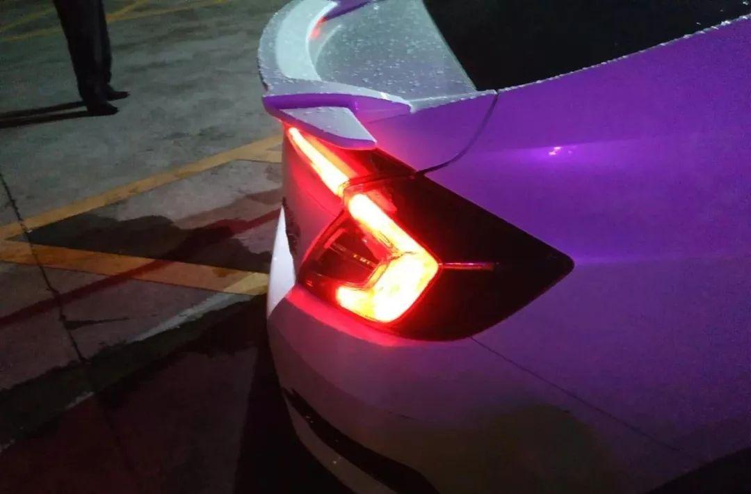 李警官走近发现,思域小车引擎盖贴上了一层黑膜,打开一看,还加装了顶杆。再看车身,比正常的思域底盘低了不少,低头一看,轮毂竟然换了大size的!不仅如此,思域的车尾还加装了尾翼,应了改装一族那句老话:“买思域不改,不如推下海”。▼