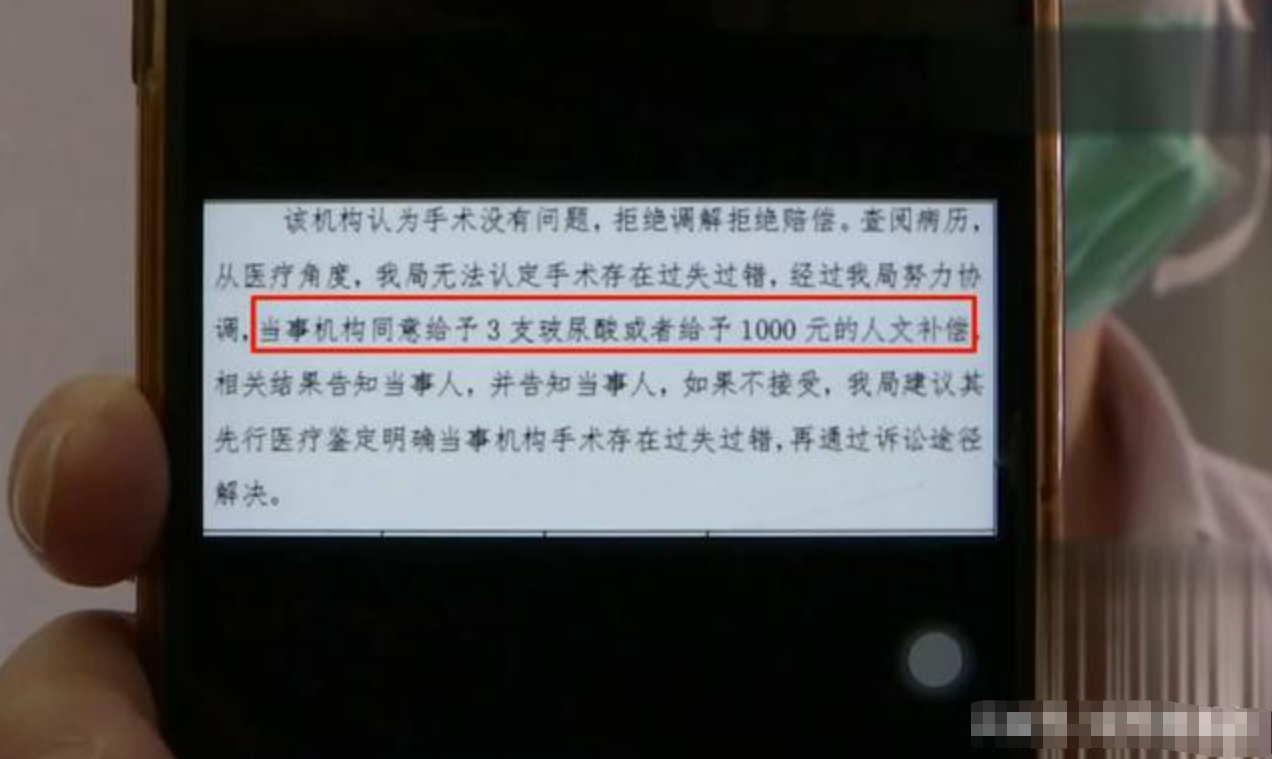 记者问负责人,能不能跟做手术的医生沟通一下。负责人说医生正在做手术,不方便回应,但对方拿出了一张图片,说是跟甘女士已经通过管理部门协商好了,医院给1000块的补偿或者赠3支玻尿酸。