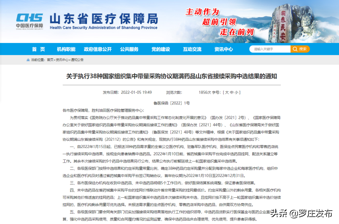 通知要求,自2022年1月15日起,已报送38种药品需求量的全省公立医疗机构、驻鲁军队医疗机构、医保定点民营医疗机构和零售药店,统一执行接续采购中选结果,按规定向患者销售中选药品。2022年1月10日前,省药械集中采购平台完成中选药品挂网、配送关系建立等工作。