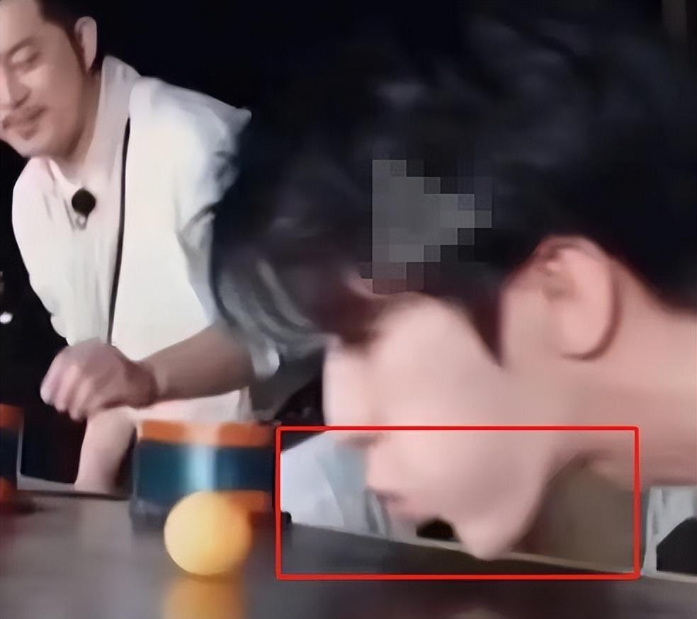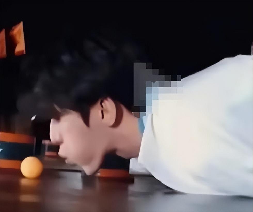 蔡徐坤在吹乒乓球时,脸颊用力鼓起,暴露了线条和形状都异于常人的下巴。