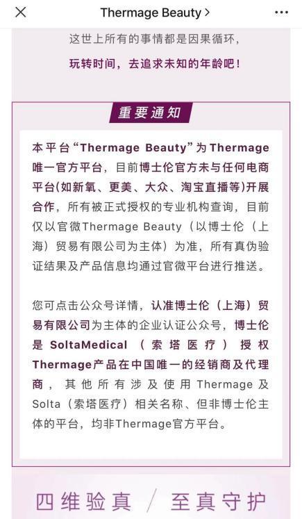 但博士伦官方早就发布过一则重要通知,通知显示,博士伦是SoltaMedical(索塔医疗)授权Thermage产品在中国的经销商及代理商,其他所有涉及使用Thermage及Solta(索塔医疗)相关名称、但非博士伦主体的平台,均非Thermage官方平台。