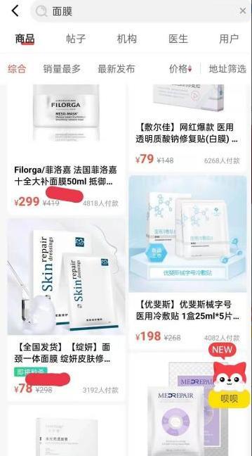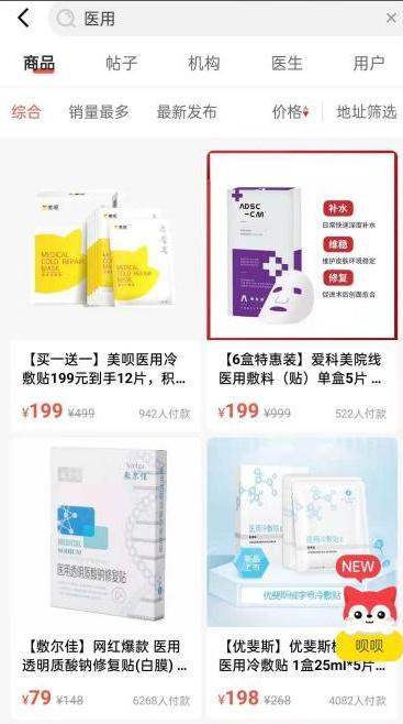 美呗医美APP对于医用器械产品宣传手段更为隐蔽,记者在以“医用”为关键字搜索时出现的是医用敷料或医用冷敷贴;但以“面膜”为关键词搜索时却发现多款医用器械产品,其将“医用”和“面膜”两个词分开使用,以规避法律监管。