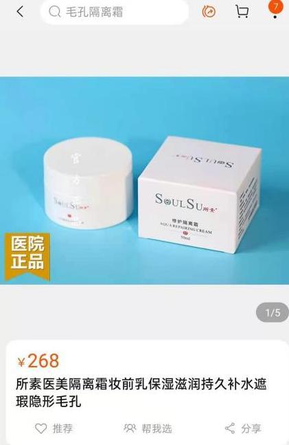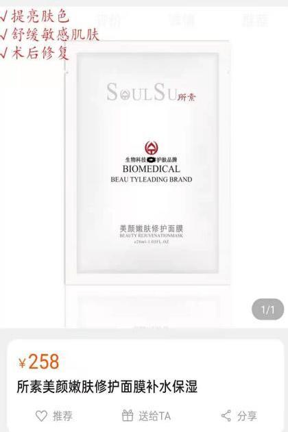 21世纪经济报道记者在淘宝平台发现一家名为“香港所素品牌直属”的商家,其在多款护肤品的宣传中明示医疗效用,其客服更是直接向记者推销其“医用面膜”。