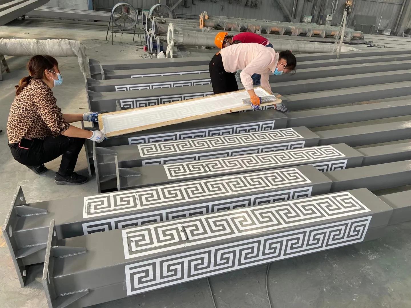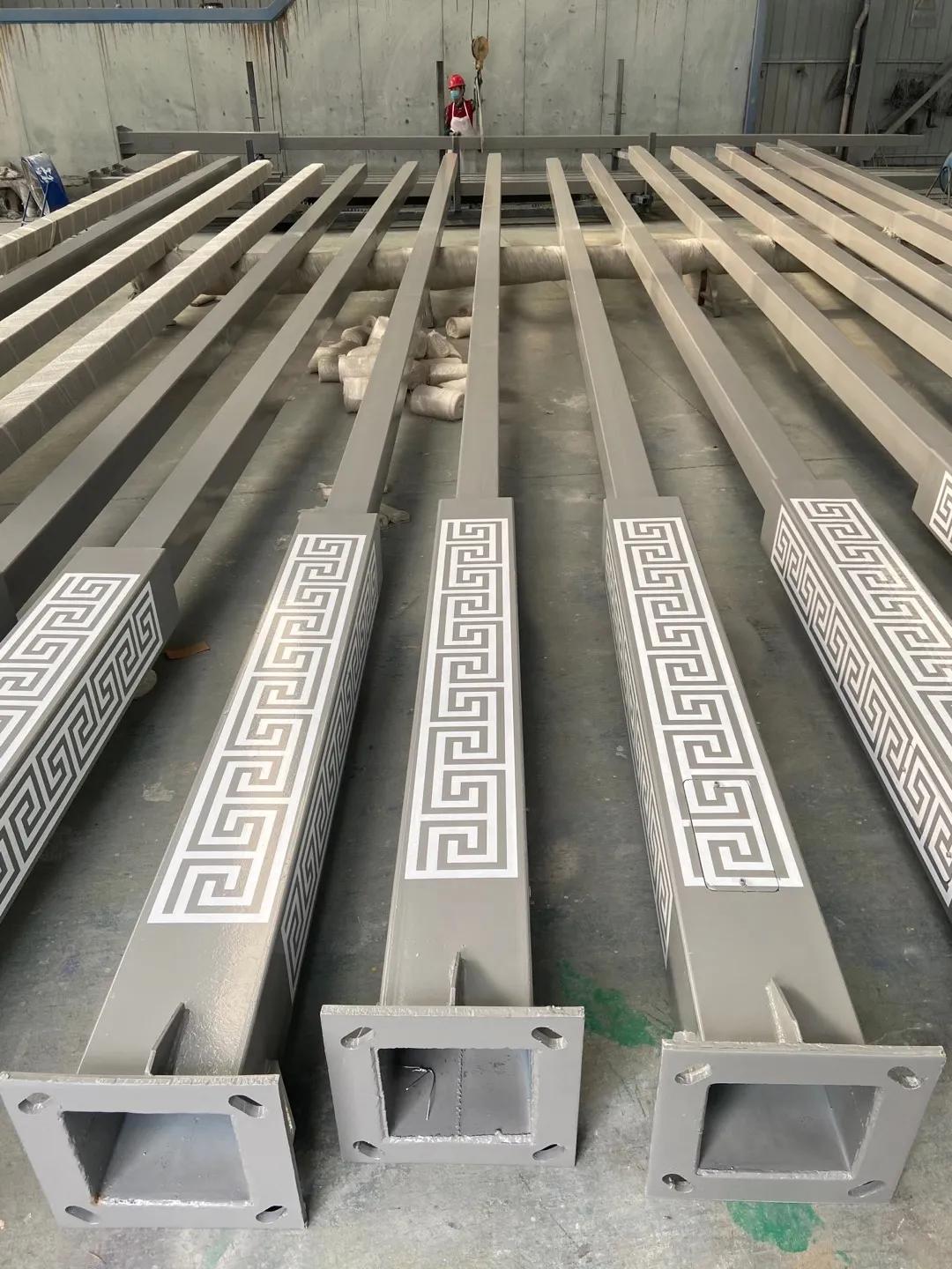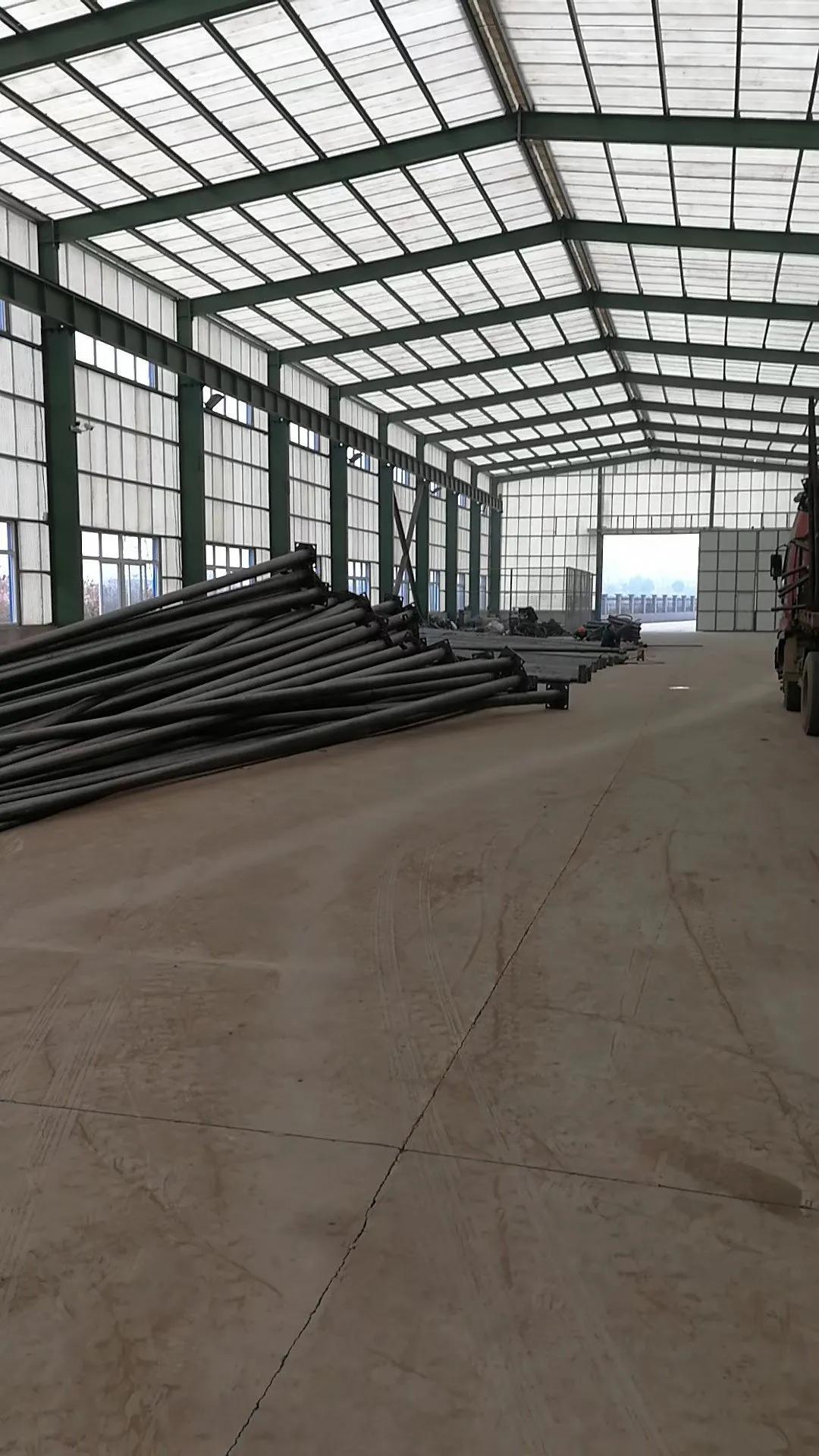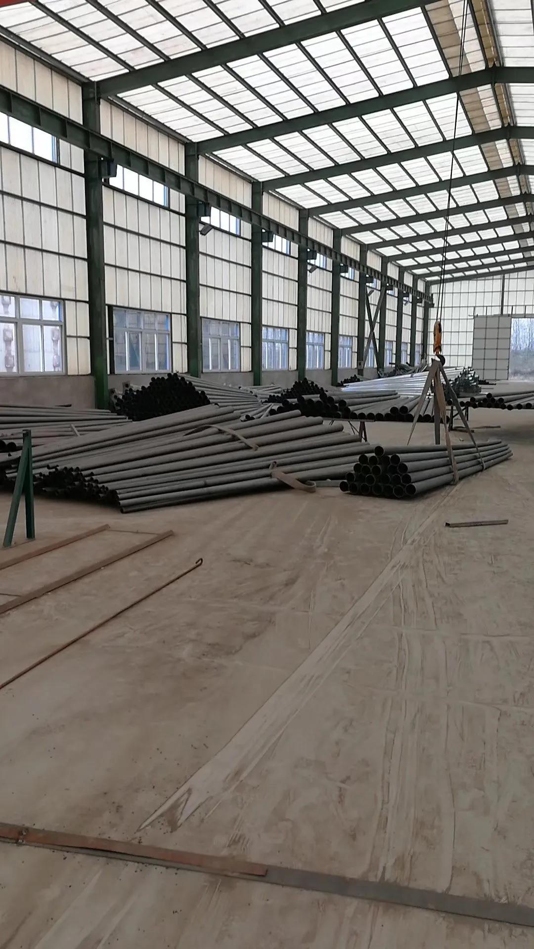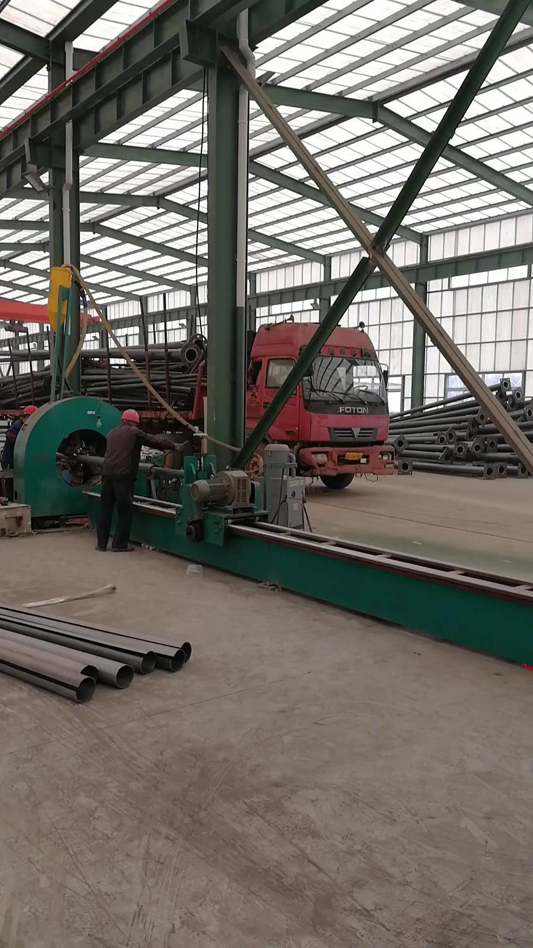 路灯杆的一般生产过程,热卷板经过开平厂下料,卷板材切成长方形条状,后经过滚剪设备把长方形条板一分为二,成为两块梯形条板,后经过1200吨折弯机多次折弯成型,(常规外形有圆形,四边形,六边形,八边形,十二边,十六边),杆子如果有特殊要求的也可以通过拉花机拉成多种异型结构(麻花状,条状,梅花状),杆件成型后在经过液压整形机把杆子校直,这样一杆毛坯杆就好了。下面就是焊接合种附件,如门框,支架,法兰,各种装饰结构。后经过打磨检验,装车去热镀锌,(热镀锌这个环节都是在外面做,污染严重),热镀锌回来再经过打磨,抛光,喷塑处理,后是打包装车。