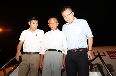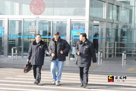 办案检察官将葛宝伟(中)带出青岛流亭机场。图片来源:正义网