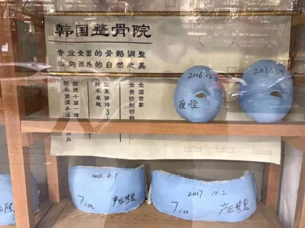 记者探访发现,整骨门店内张贴前后对比图是标配,有的还在橱窗中摆放着展示产后骨盆修复以及脸部大小的石膏模型,上面标注着不同日期,而这些模型是按照每次做完整骨后的顾客情况复刻的。